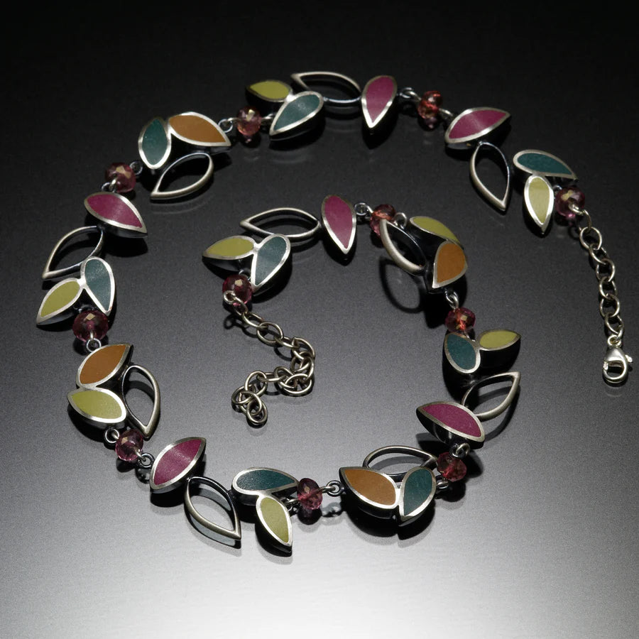 Clusters of multicolor enamel leaves accented with ruby beads. Handcrafted with blackened sterling silver, polymer clay and ruby. Necklace measures .5" x 17.5". Made in USA.